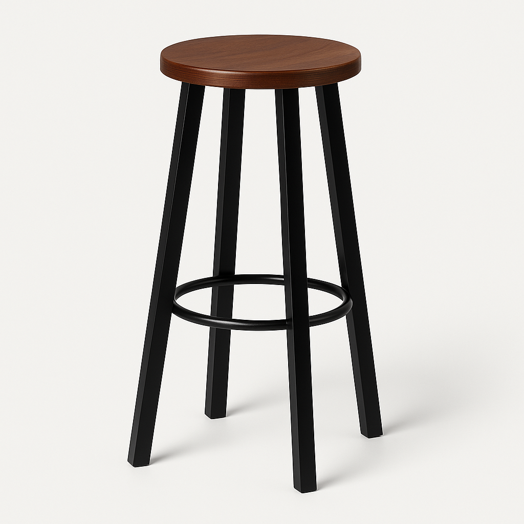 Deze barkruk is door het stalen frame een ijzersterke barkruk. De zitting is van noten gebeitst beuken multiplex met een blanke laklaag en het frame heeft een zwarte epoxy laag.