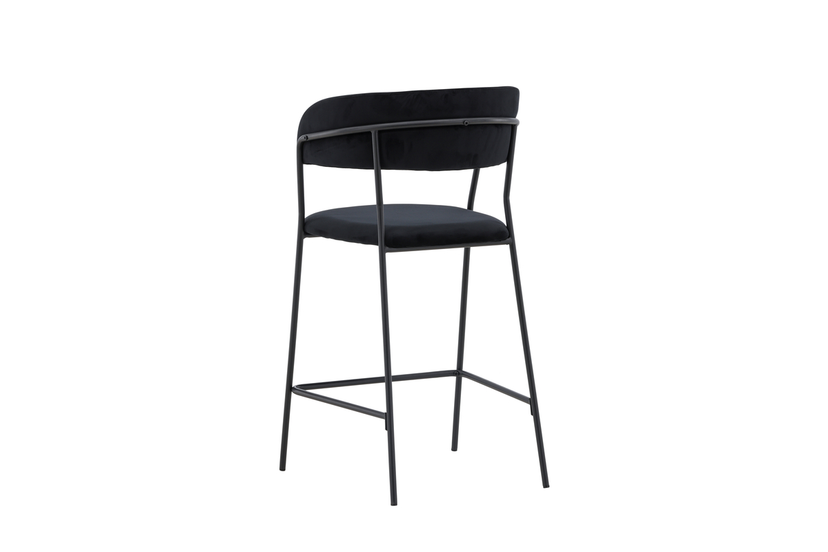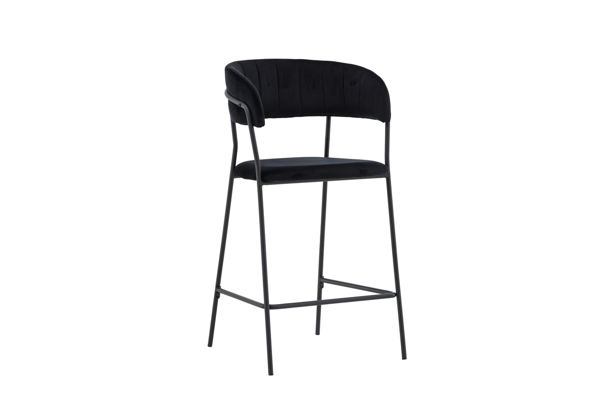 Deze barkruk heeft een volledig gestoffeerd ontwerp met een licht afgeronde rugleuning en zitting in fluweel met stijlvolle sierstiksels. De stoelpoten zijn smal uitgevoerd in zwart staal en voorzien van een geïntegreerde voetsteun gegarandeerd net zo stijlvol als comfortabel.